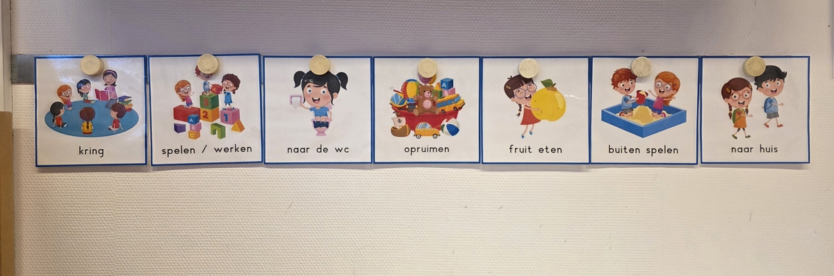 Wij werken met een vast dagritme. Dit is zichtbaar met dagritmekaarten. Een vast ritme geeft jonge kinderen rust en duidelijkheid.